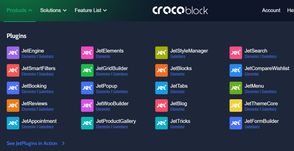 Now let’s take a look at the plugins that Crocoblock offers: The first is the JetPlugins super suite, which includes many different modules such as: